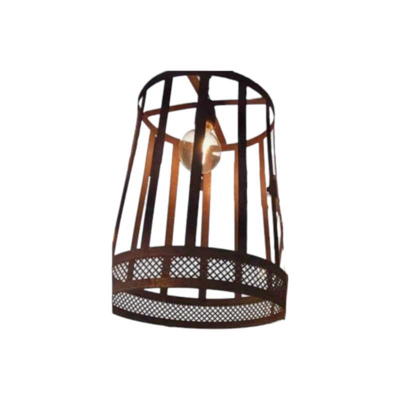 Lámpara colgante de 1 luz con estructura abierta en metal con acabado óxido, ideal para aportar un estilo rústico e industrial a cualquier espacio. Su diseño combina varillas verticales y detalles en malla calada en la parte inferior, generando un atractivo juego de luces y sombras.
