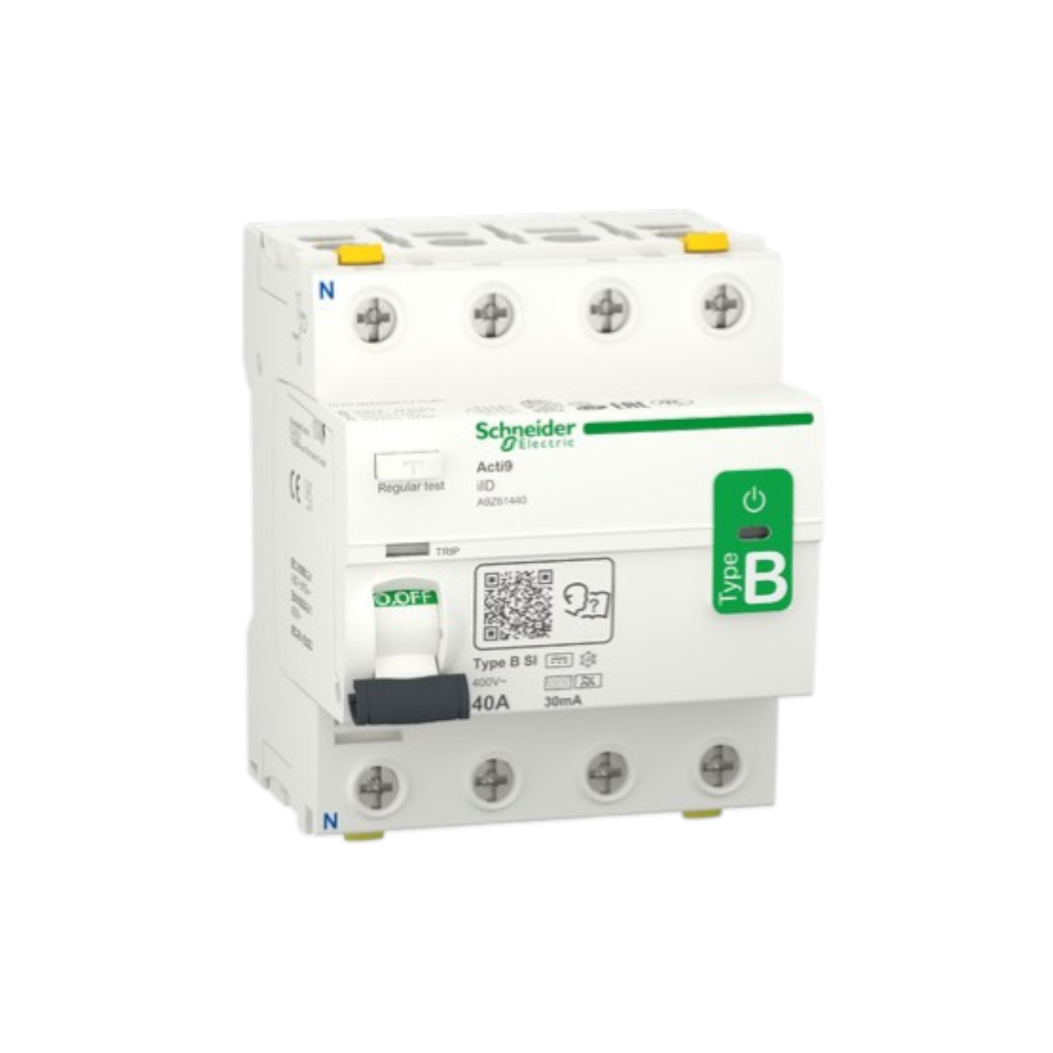 Este iID Acti9 es un disyuntor de corriente residual (RCCB) modular y confiable. Es un disyuntor de 4 P con corriente nominal In de 40 A, clase de protección de tipo B-SI y una sensibilidad de fuga a tierra de 30 mA. Este producto protege contra descargas eléctricas mediante contacto directo o indirecto y peligros de incendios. Realiza la función de desconexión de circuitos eléctricos en caso de falla a tierra. Su exclusivo indicador de disparo de visita reduce el tiempo de intervención al mostrar el dispositivo defectuoso con un indicador mecánico en la parte frontal. Este producto también cuenta con una ventana VisiSafe con una tira verde en la palanca que indica la apertura completa de los polos, lo que permite el mantenimiento aguas abajo Este producto cumple con el estándar IEC/EN 61008-2-1 e IEC/EN 62423. La capacidad nominal de apertura y de cortocircuito (Im/? ?m) es de 1500A. La corriente de cortocircuito nominal condicional (Inc/? ?c) es de 10kA. La resistencia eléctrica es de hasta 15000 ciclos. La resistencia mecánica es de hasta 20000 ciclos. El voltaje de funcionamiento de la unidad es de 400 V CA. Es montable en riel DIN. La anchura en pasos de 9 mm es 8. El grado de contaminación es 3. La categoría de sobretensión es IV. El color del producto es blanco (RAL9003). Las dimensiones son (An.) 72 mm x (Alt.) 88 mm x (Prof.) 79 mm. El peso es de 415g. Posee un grado de protección IP20. Se convierte en IP40 una vez en carcasa modular de acuerdo con el estándar IEC/EN 60529. La temperatura de funcionamiento es de -25°C a 60°C. La temperatura de almacenamiento oscila entre -40°C y 85°C.