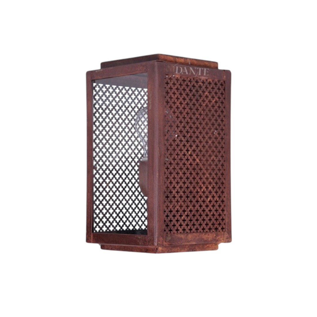 Aplique de pared rectangular para exterior, diseñado para aportar iluminación decorativa y seguridad en galerías, patios, entradas o fachadas. Su estructura metálica con acabado efecto óxido le otorga un estilo rústico y distintivo.