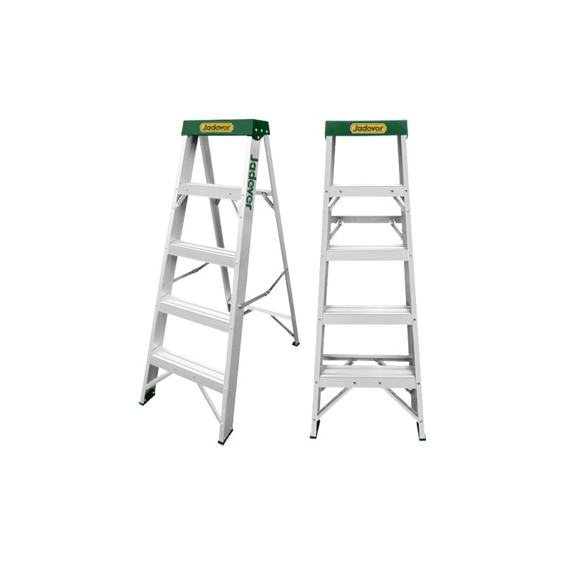 Fabricada completamente en aluminio, combina ligereza con resistencia, lo que facilita su traslado y uso frecuente. Incluye 4 escalones principales y una plataforma superior que funciona como quinto peldaño, brindando mayor superficie de apoyo al usuario.