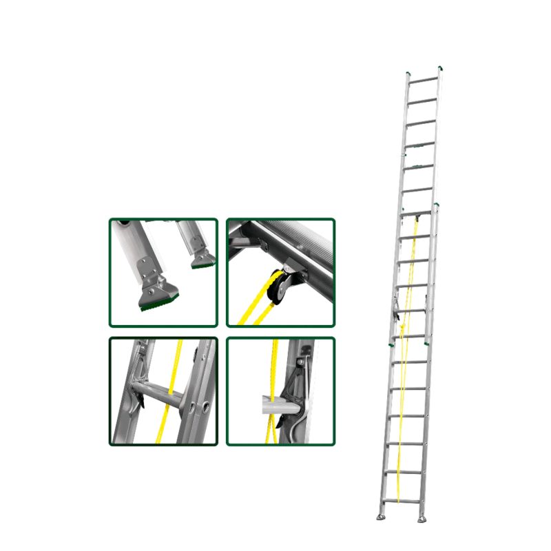 La escalera extensible 2×12 es una herramienta robusta y confiable, ideal para tareas en altura que requieren máxima seguridad y alcance. Su diseño de doble tramo permite extenderla hasta 6,40 metros, ofreciendo gran versatilidad para trabajos de mantenimiento, construcción, instalaciones eléctricas o limpieza en exteriores.