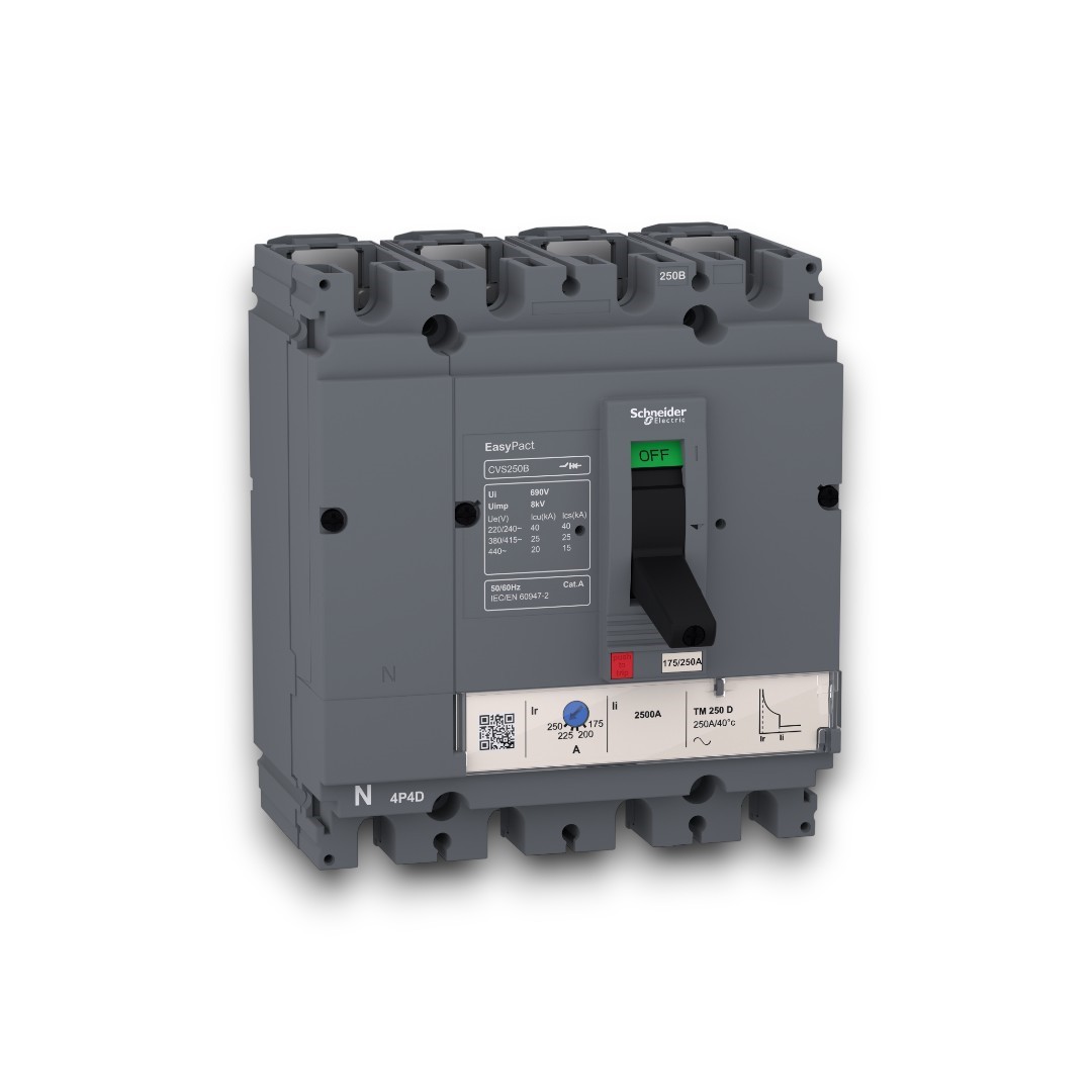 “Easypact de Schneider Electric es la solución fácil y sencilla que responde a todas las necesidades en términos de protección de instalaciones eléctricas de baja tensión.” “EasyPact CVS160B es un interruptor termomagnético, o llave térmica, fijo 3d de 4P polos con un alto nivel de rendimiento y funcionalidad económica.” “Es una opción óptima para aplicaciones de protección de edificios pequeños y medianos.” “La capacidad de corte (Icu) es de 25kA rms a 415VCA 50/60Hz. ” “La tensión de funcionamiento es 440 VCA 50/60 Hz.” “Esta llave térmica incluye una unidad de control magnetotérmica (TMD) de clasificación 125A.” “La unidad de desconexión TMD proporciona una protección térmica ajustable contra sobrecargas y una protección magnética fija.” “Esta versión de 4 polos con dimensiones de 105mm (An.) x 161mmn (Alt.) x 86mm (Prof.), incluye una variedad de funciones y accesorios opcionales.” “Además, puede instalarse en paneles de conmutación de aislamiento de clase II, ya que es un dispositivo de cara frontal clase II (IEC 60664-1).” “Este producto cumple las normas internacionales (IEC 60947, CCC, EAC).” “Los interruptores termomagnéticos Easypact CVS cuentan con la etiqueta Green PremiumTM,” “la cual promete el cumplimiento de las reglamentaciones más recientes, transparencia sobre los impactos medioambientales, productos circulares y de bajo nivel de CO2.”